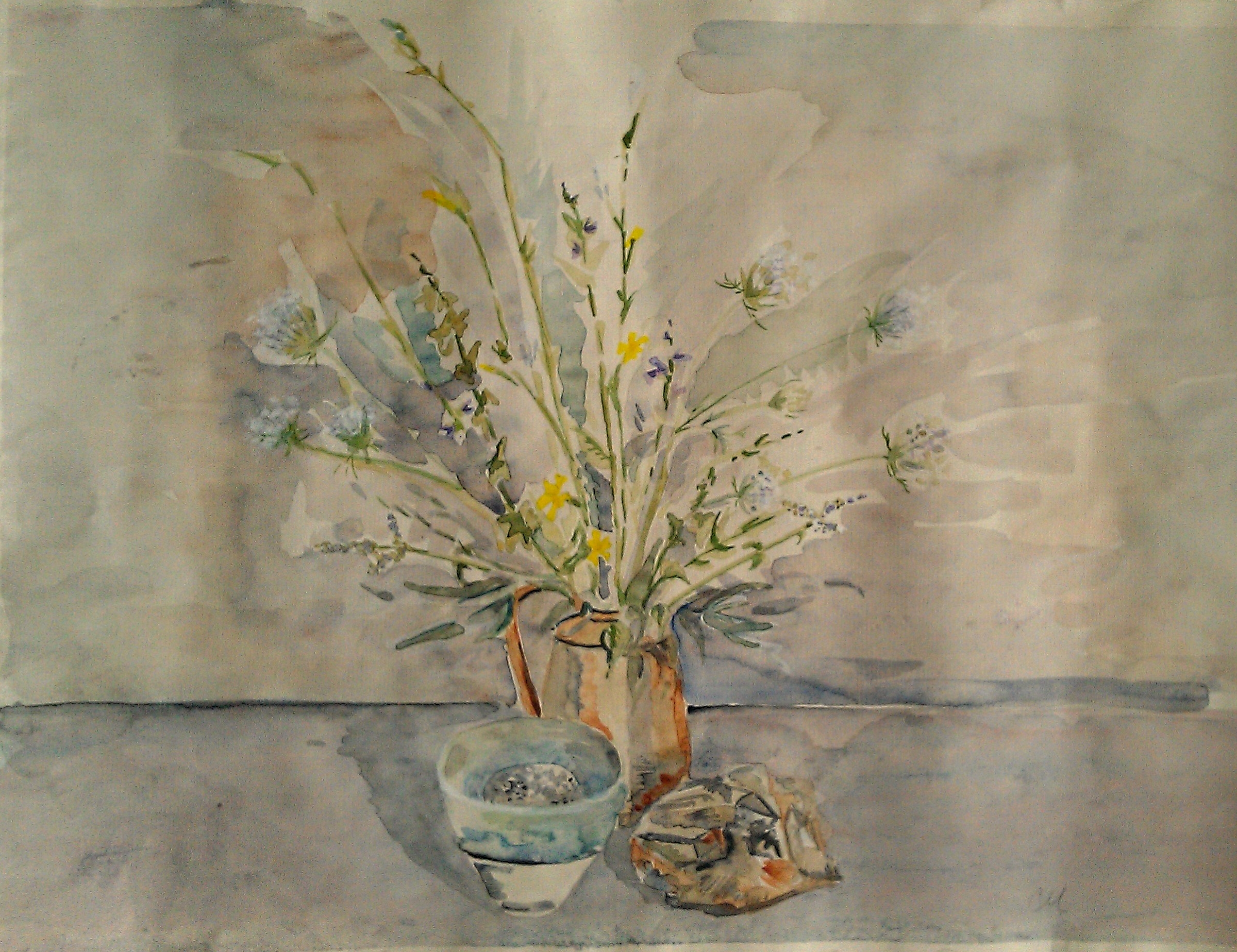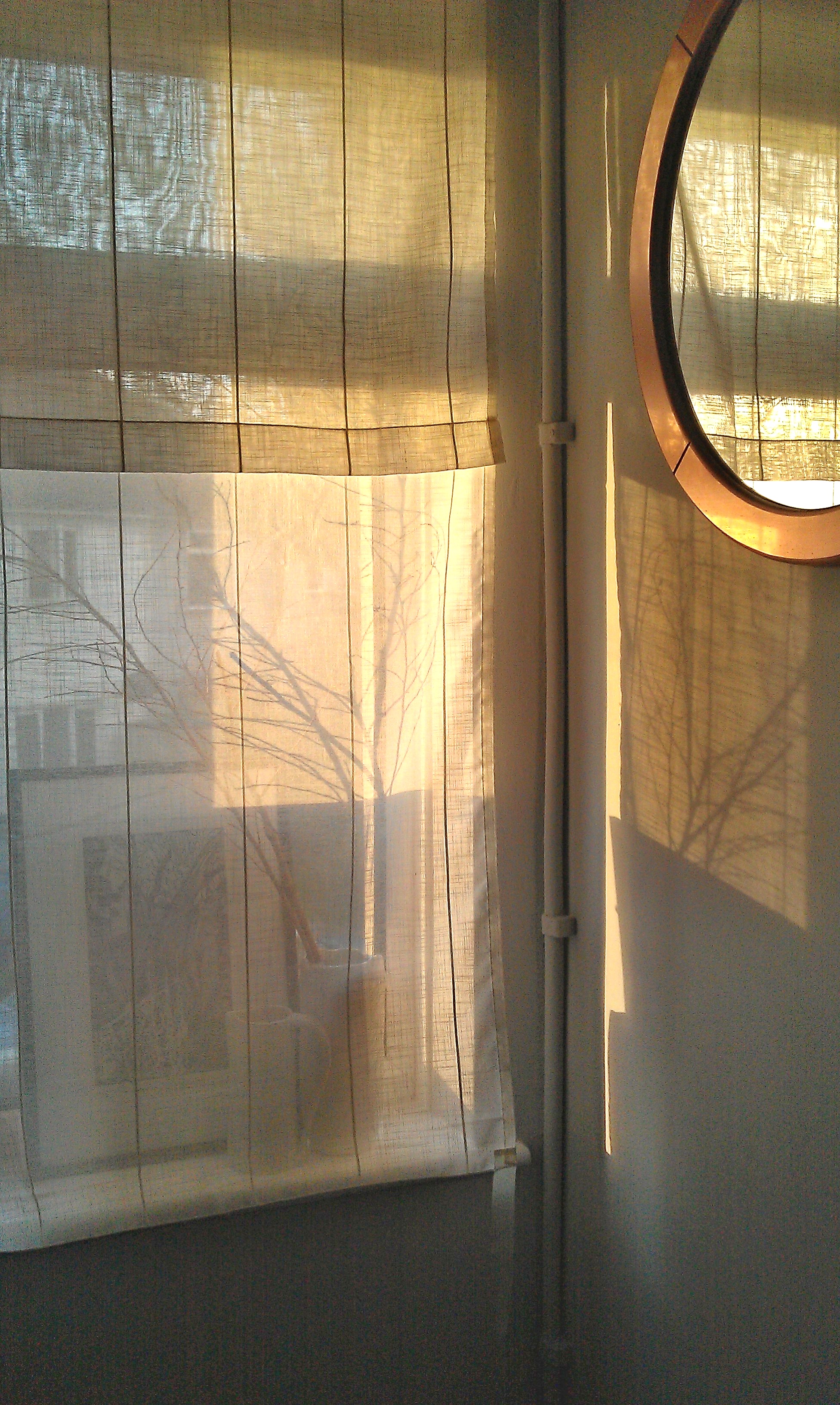 On the landing window: A print by Robert Jones titled ‘Edgelands’ and one of my wobbly pots with winter branches.